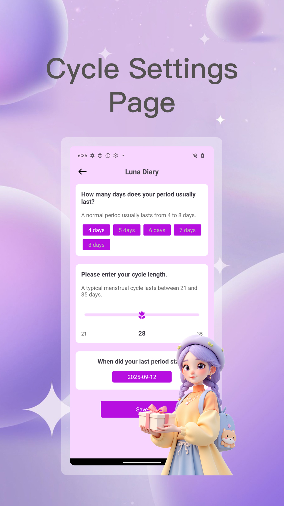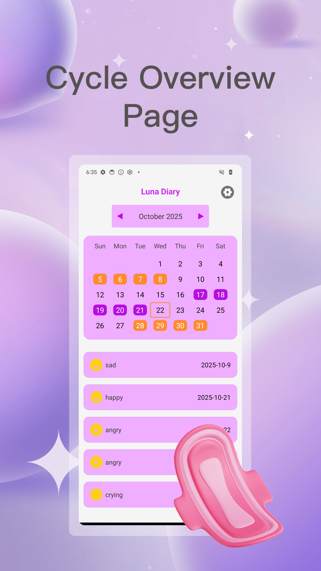 Luna Diary helps women record and track their menstrual cycles with simple and clear features.